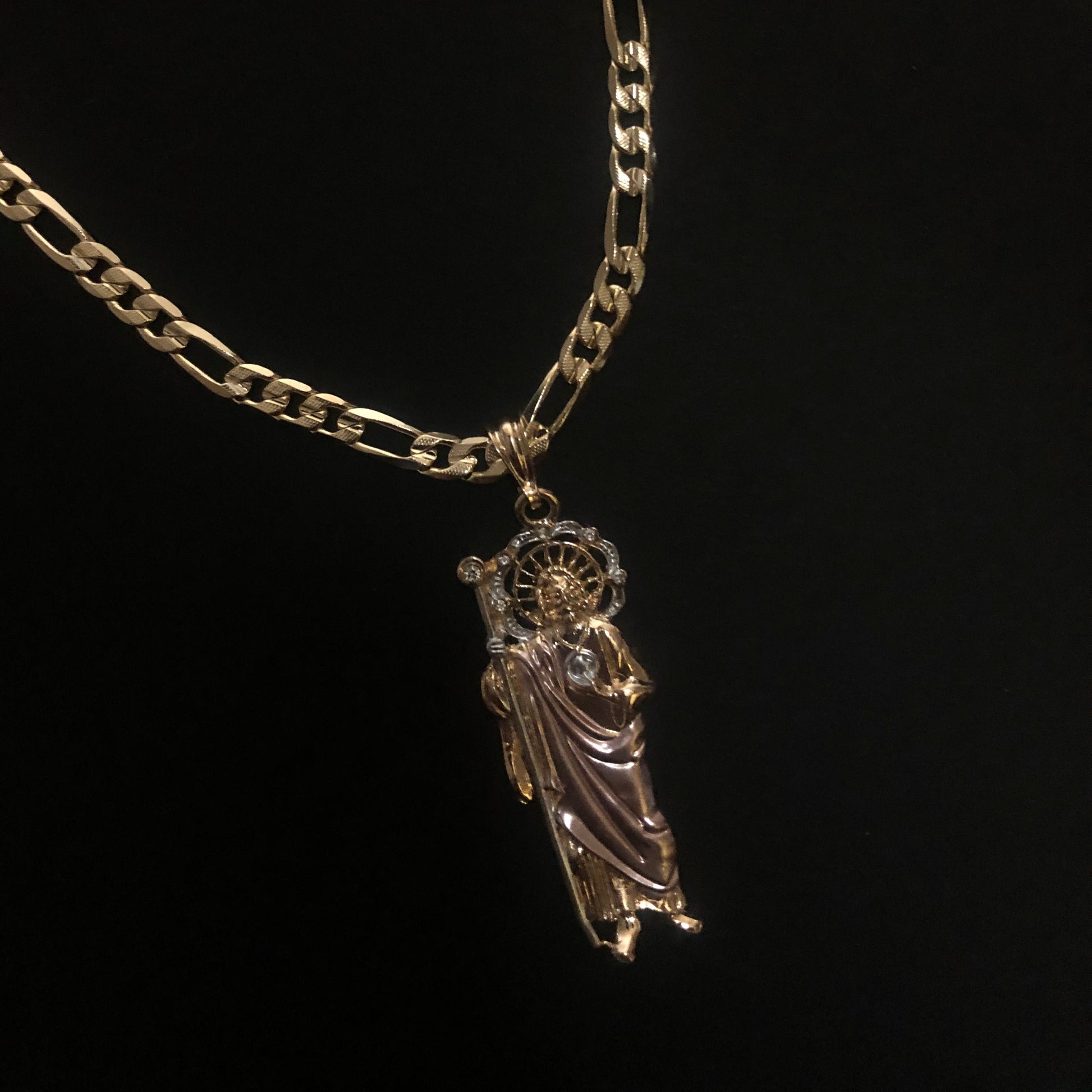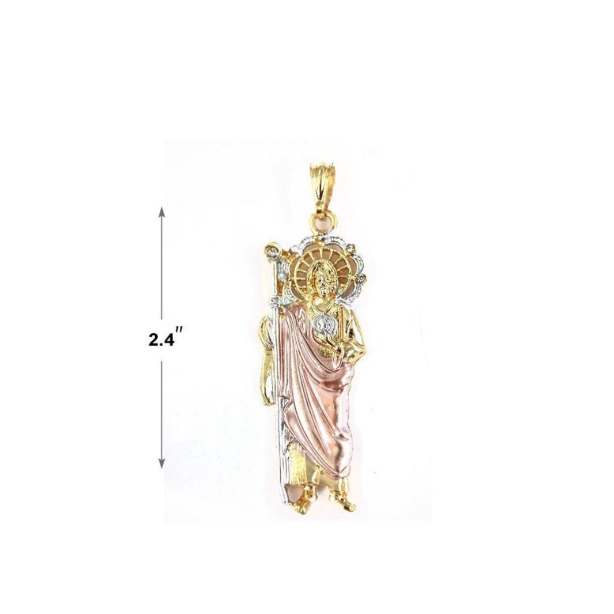 Gold-plated pendant featuring San Judas Tadeo in a green robe. Finished with five layers of plating for exceptional durability and a lasting shine.