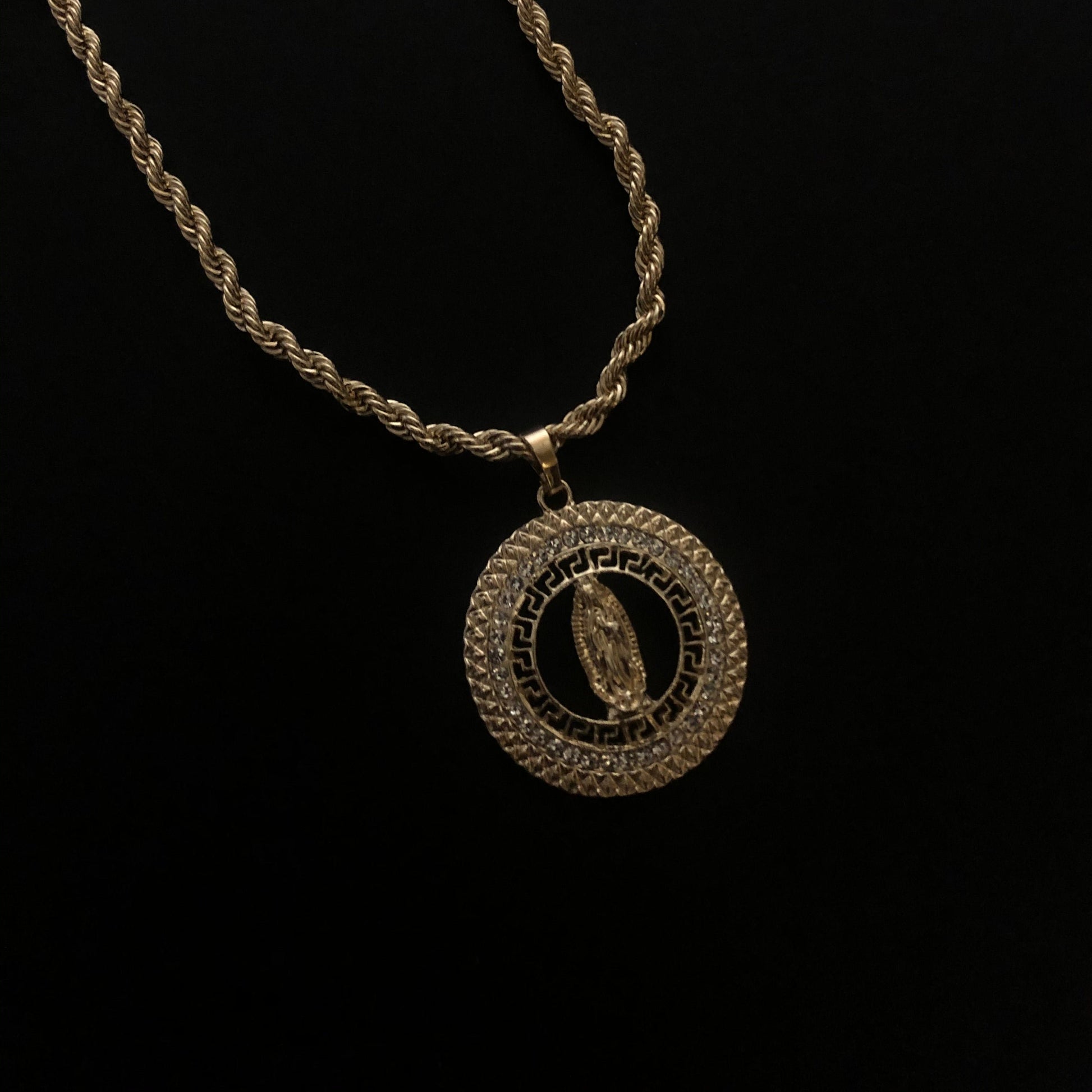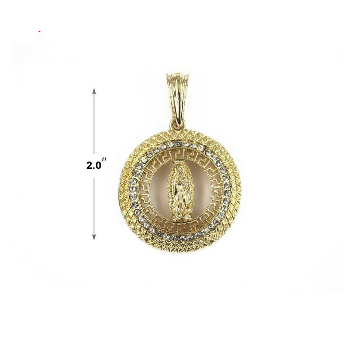 Colgante bañada en oro que presenta a la Virgencita. Acabado con cinco capas de baño para una durabilidad excepcional y un brillo duradero.