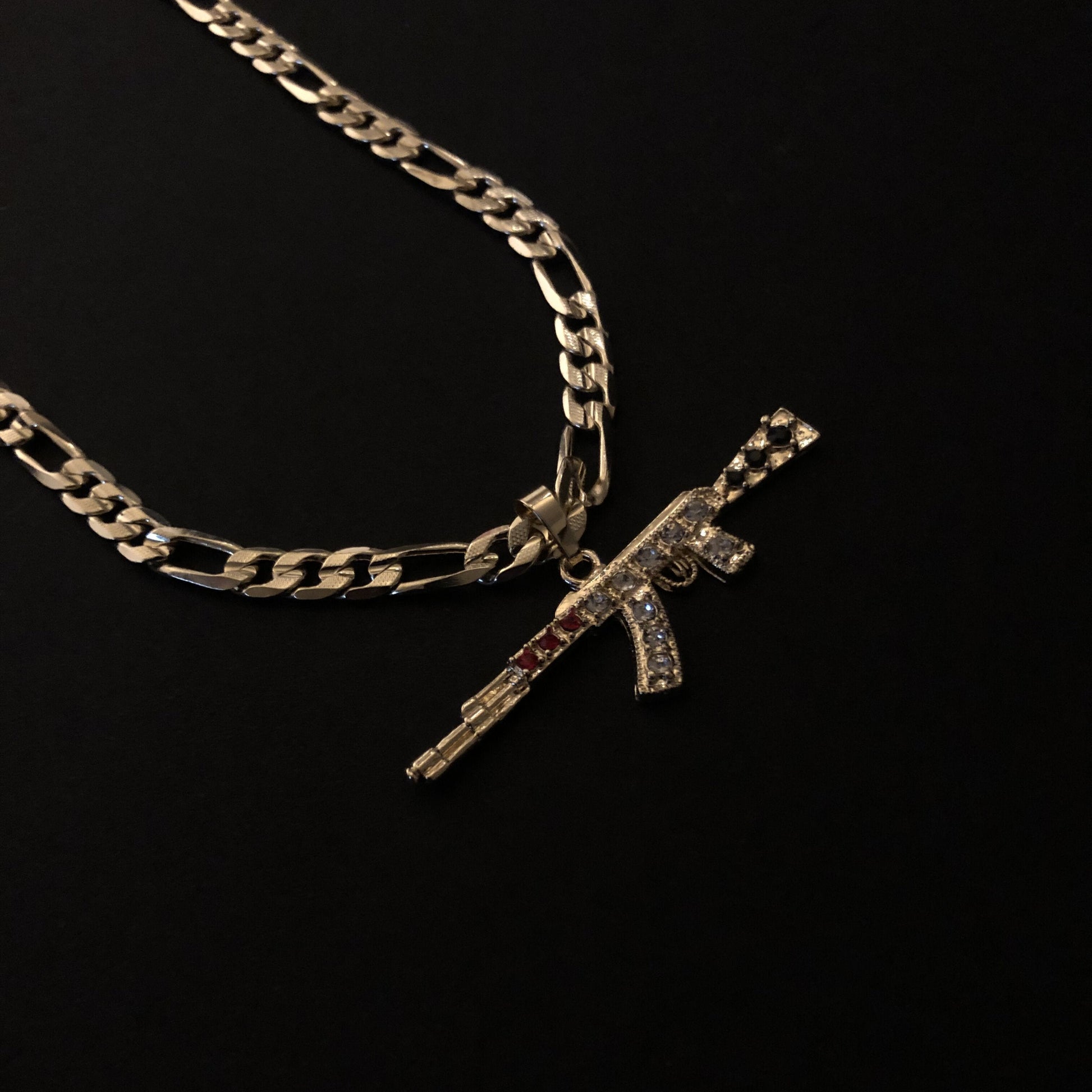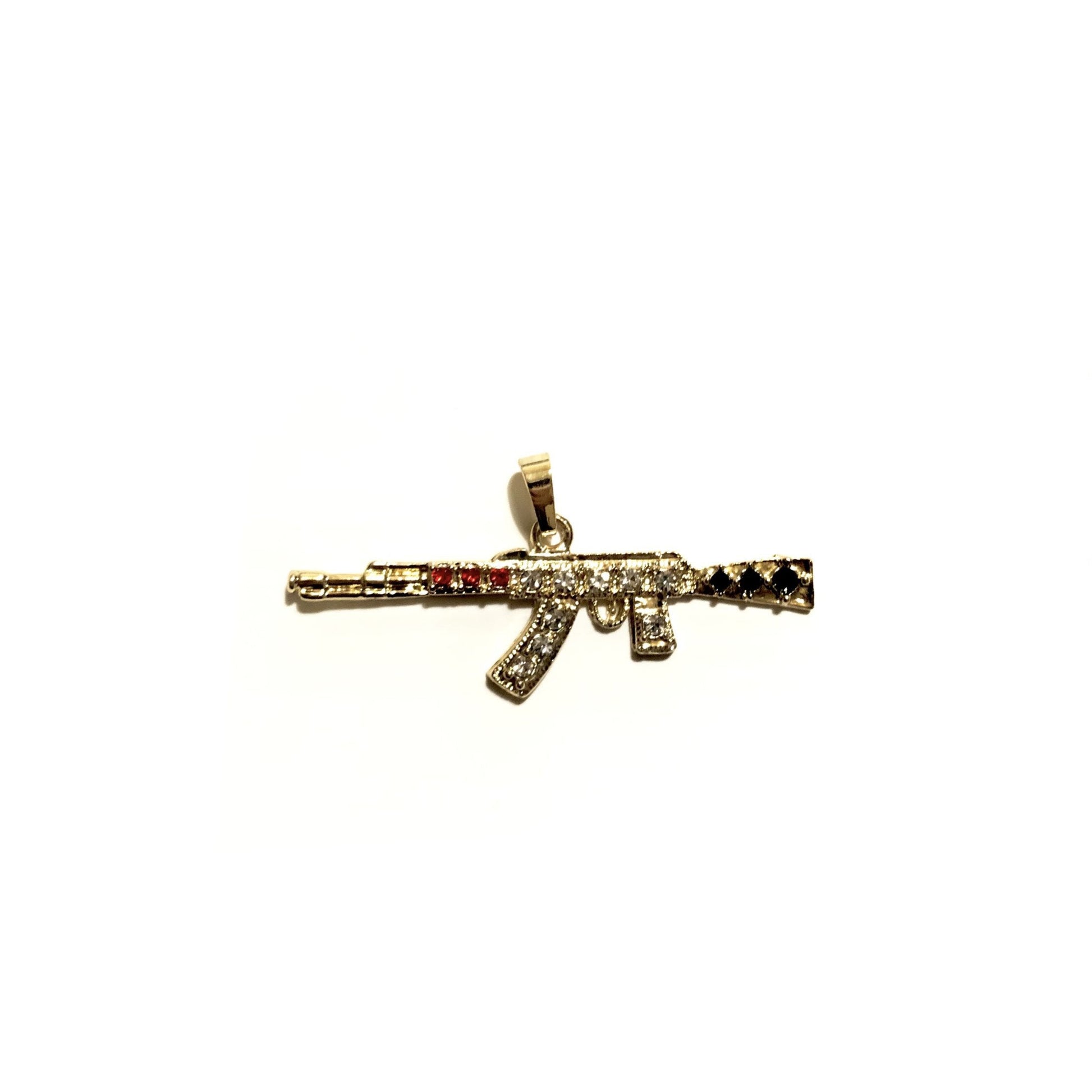 Colgante bañada en oro que presenta una AK47. Acabado con cinco capas de baño para una durabilidad excepcional y un brillo duradero.