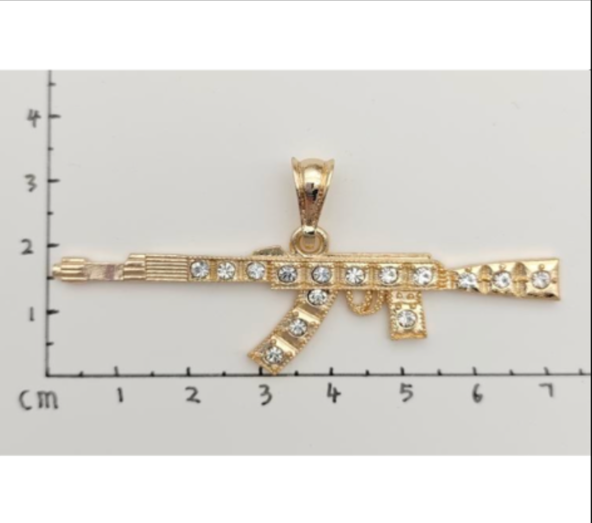 Gold-plated pendant featuring a AK47. Finished with five layers of plating for exceptional durability and a lasting shine. Suggested retail price: $25 per piece.
