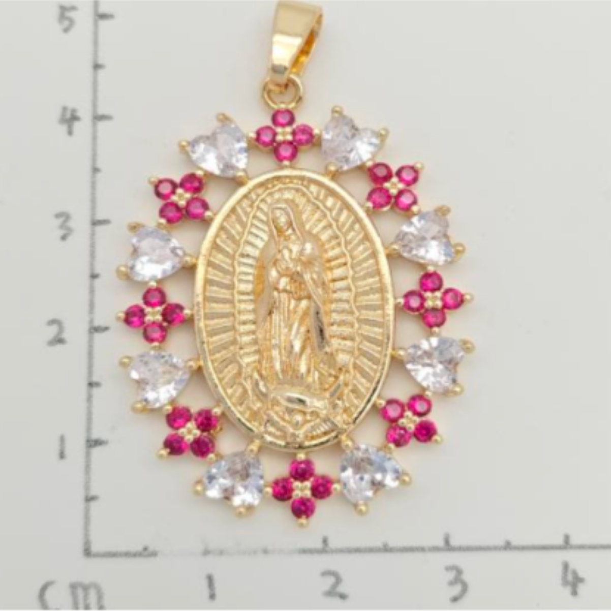 Colgante bañada en oro que presenta a la Virgencita, adornado con piedras blancas. Acabado con cinco capas de baño para una durabilidad excepcional y un brillo duradero.