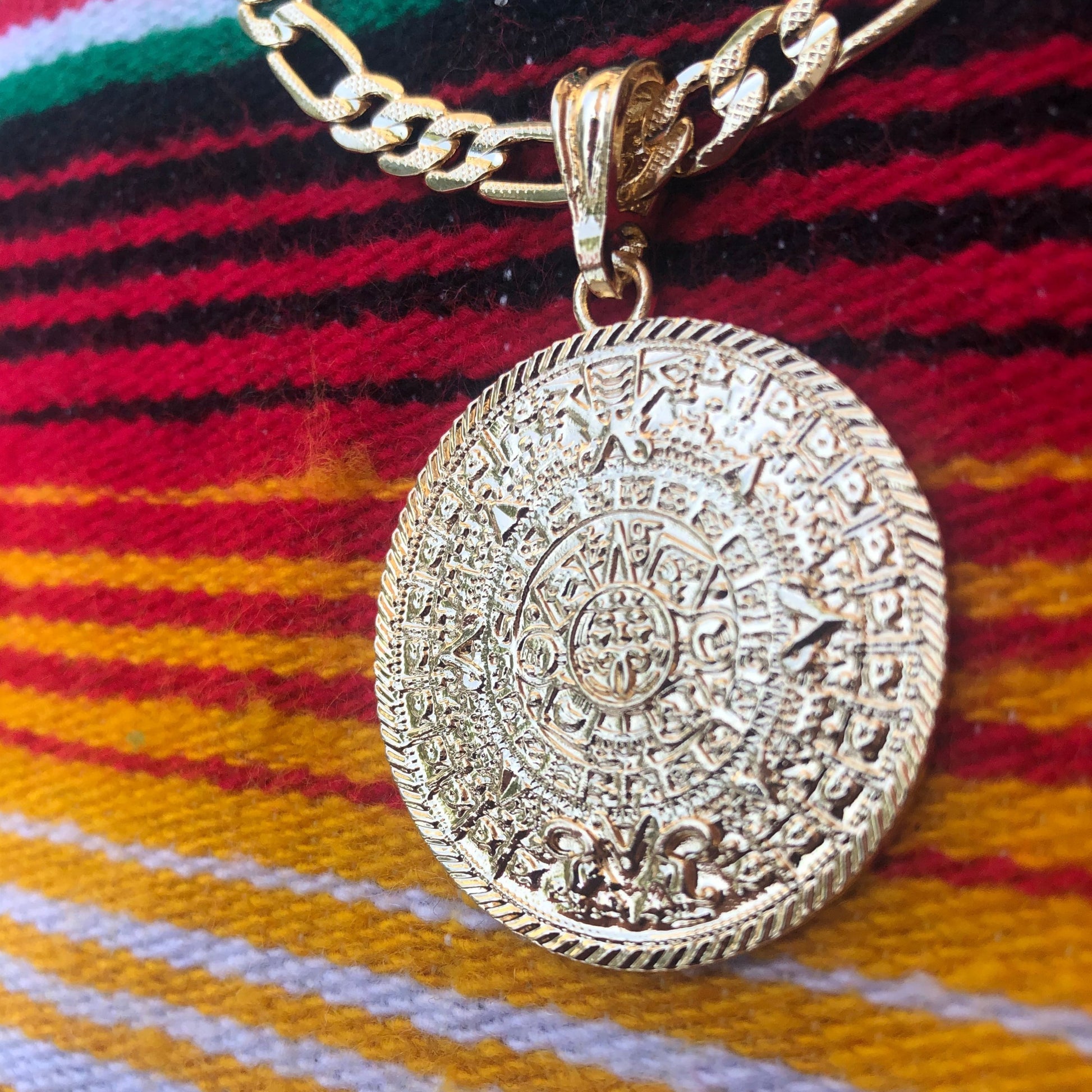 Colgante bañada en oro que presenta un dije Azteca. Acabado con cinco capas de baño para una durabilidad excepcional y un brillo duradero.