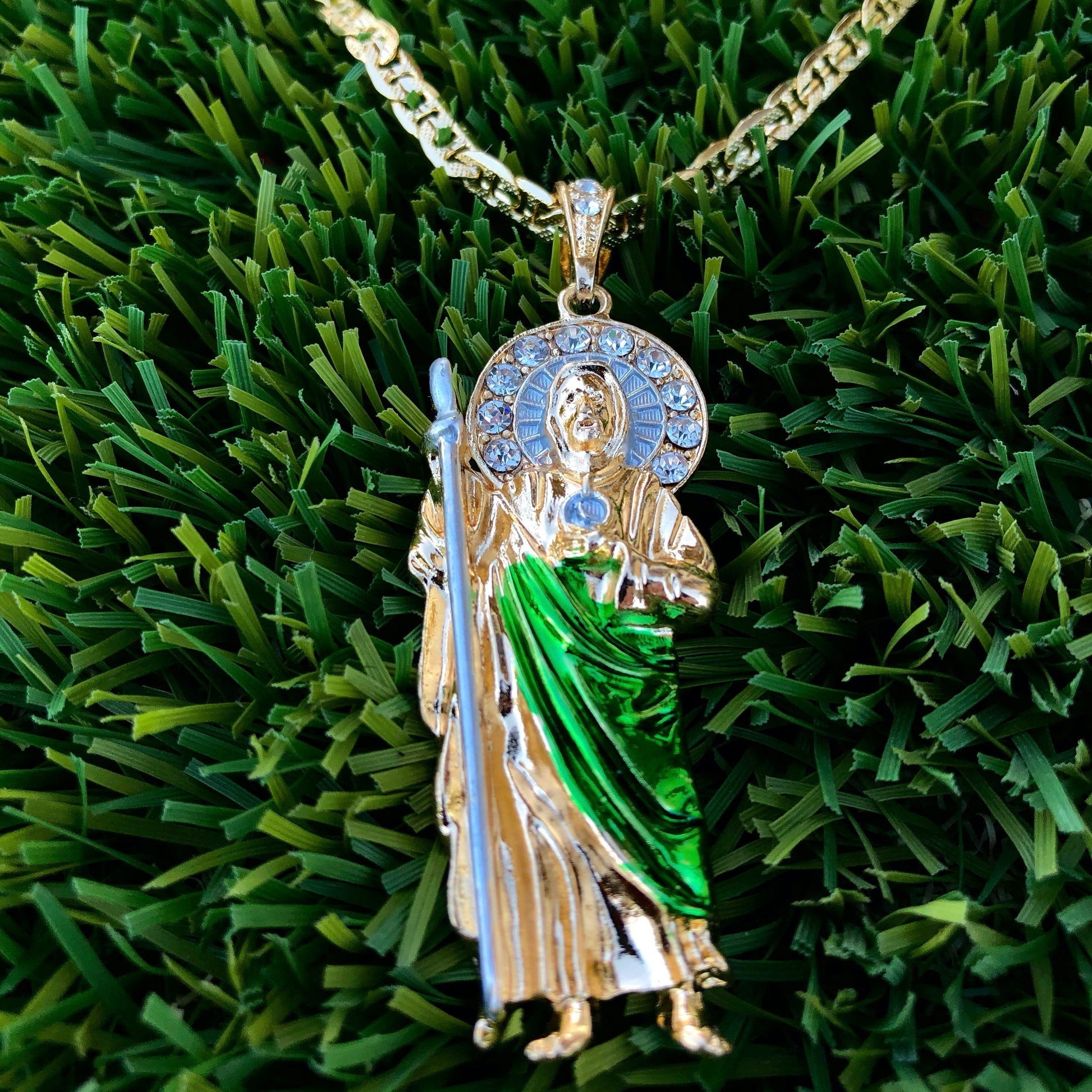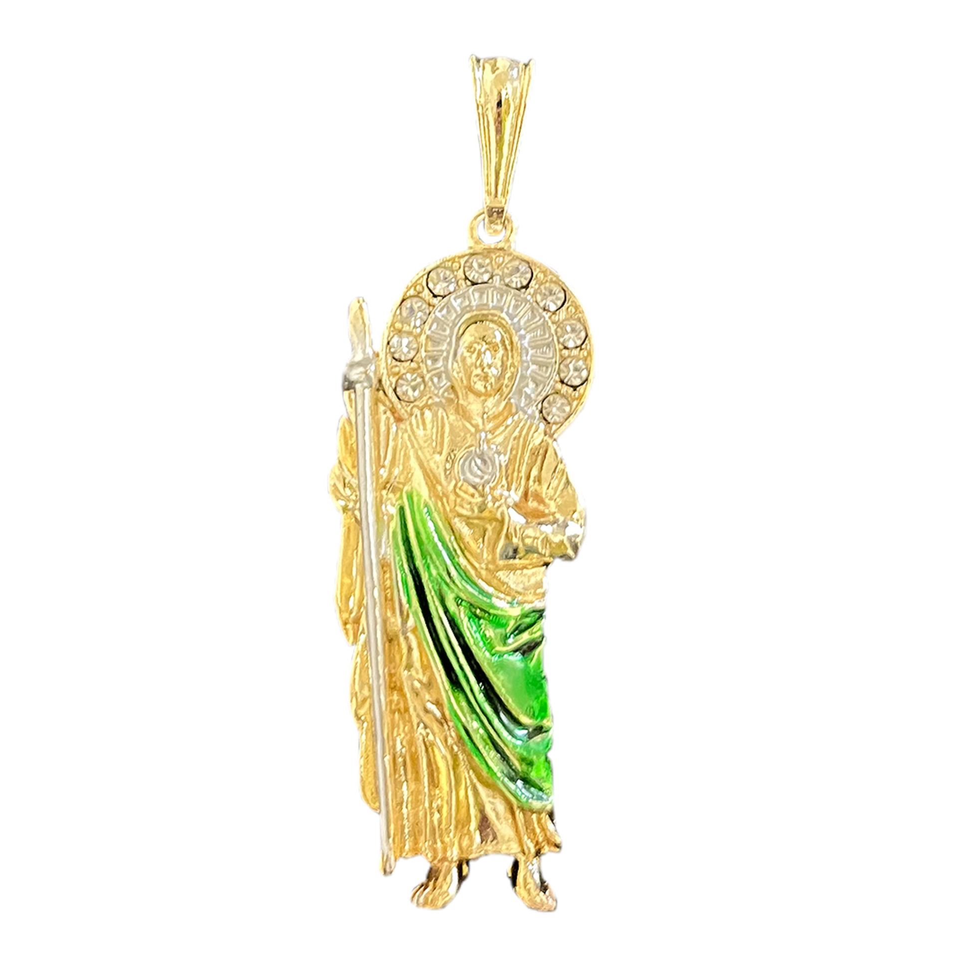 Gold-plated pendant featuring San Judas Tadeo in a green robe. Finished with five layers of plating for exceptional durability and a lasting shine.