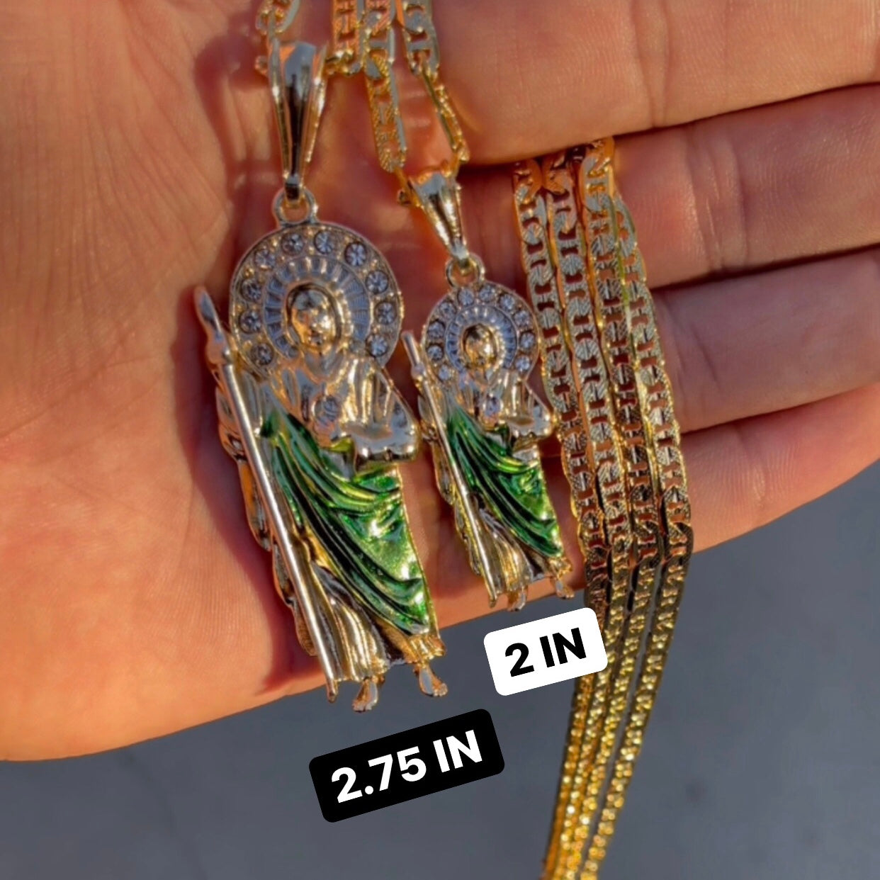 PE2 Small San Judas Tadeo With Green Robe Chain (White Stones)